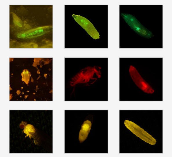 果蠅幼蟲(chóng)和成蟲(chóng)在體視顯微鏡下發(fā)出的熒光